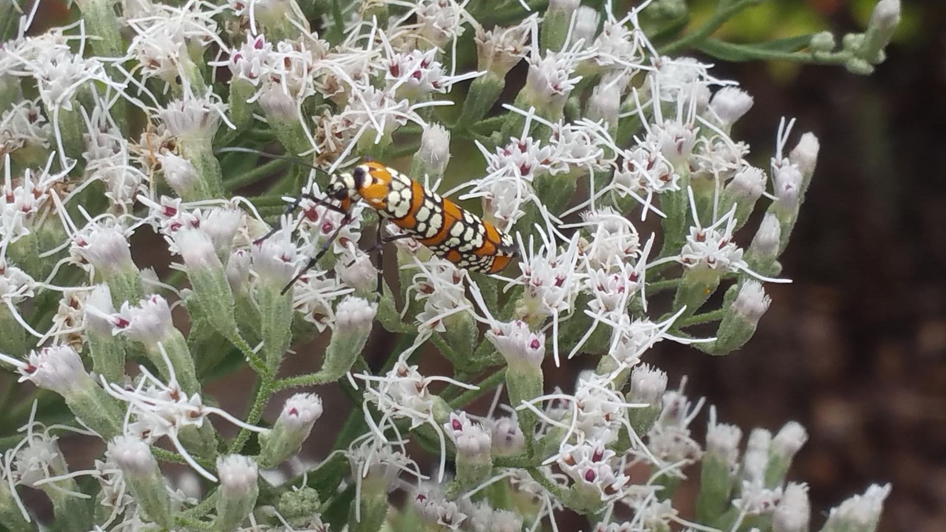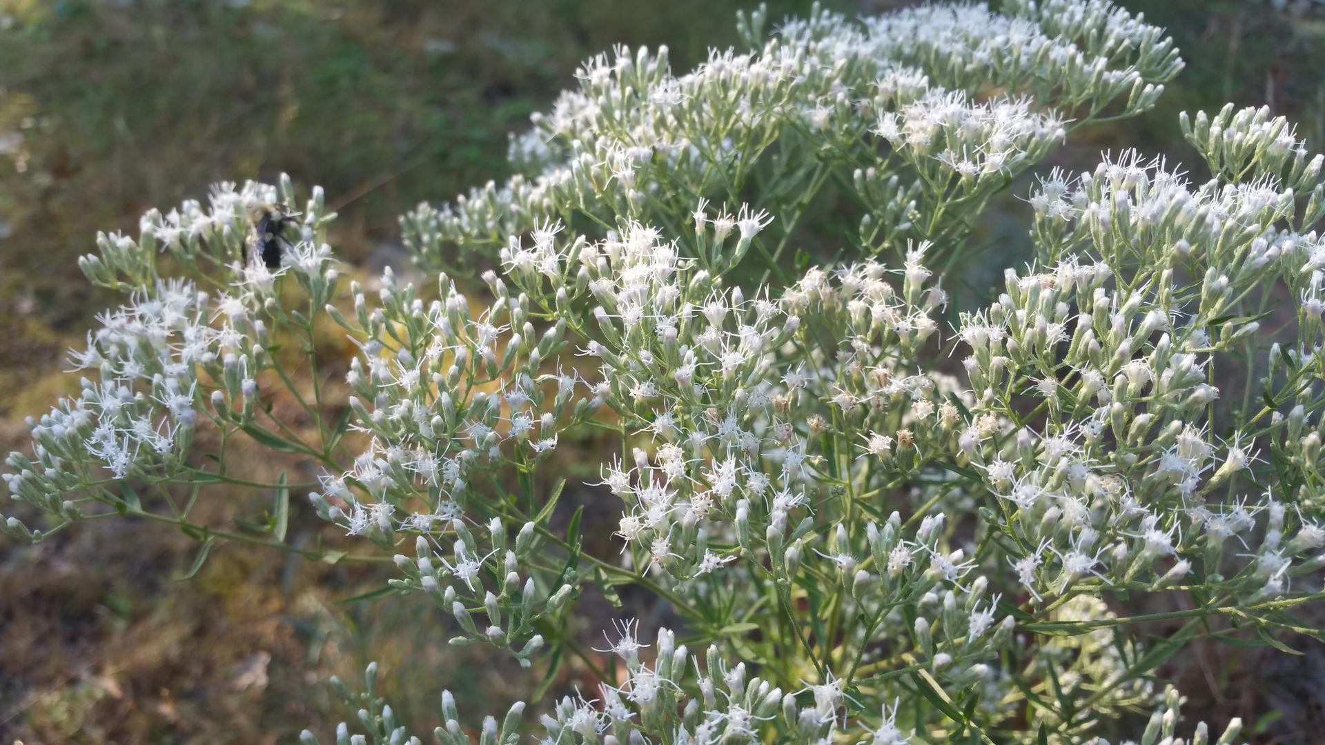 A tall wispy plant stood about three feet above the rest all summer, seemingly out of place and something you want to yank out. But it was spared and thank goodness. For while most of the plants around it became brown and never flowered due to the severe drought, the modest looking green stem with narrow leaves in whorls of four showed itself last week. The hyssop-leaved boneset has just come into flower, much to the delight of a plethora of pollinators: bumble bees, common green bottle flies, a variety of wasps, syrphid flies, and this brightly colored ailanthus webworm moth.