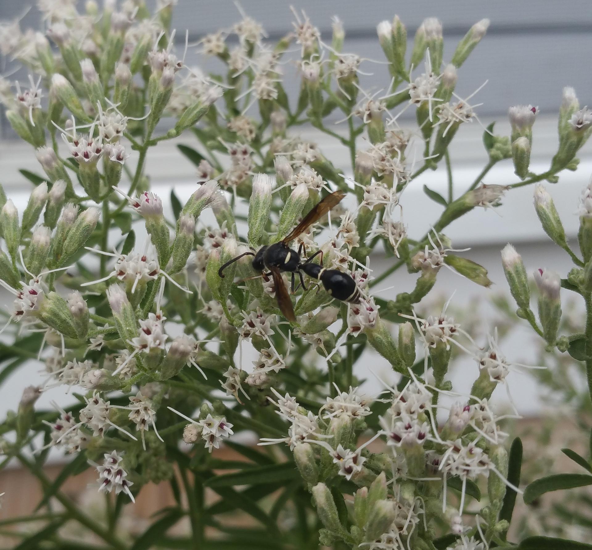 Potter wasps will rarely sting, unless touched. Potter wasps are especially attracted to goldenrods, asters and hyssop-leaved boneset because as you see, the adults like the nectar. |