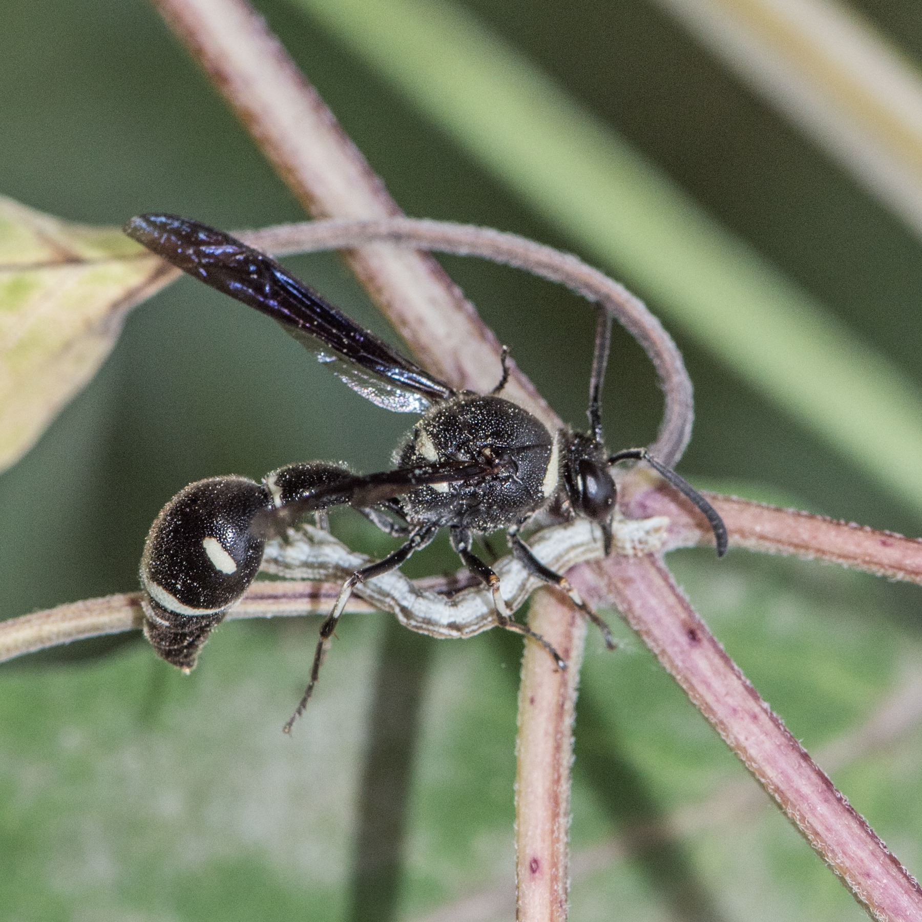Featured below is the fraternal potter wasp (Eumenes fraternus).This small black and white wasp is very docile. It didn't care that I was close, zooming in with my phone to take her picture. Potter wasps are non-aggressive and live a solitary life after mating.