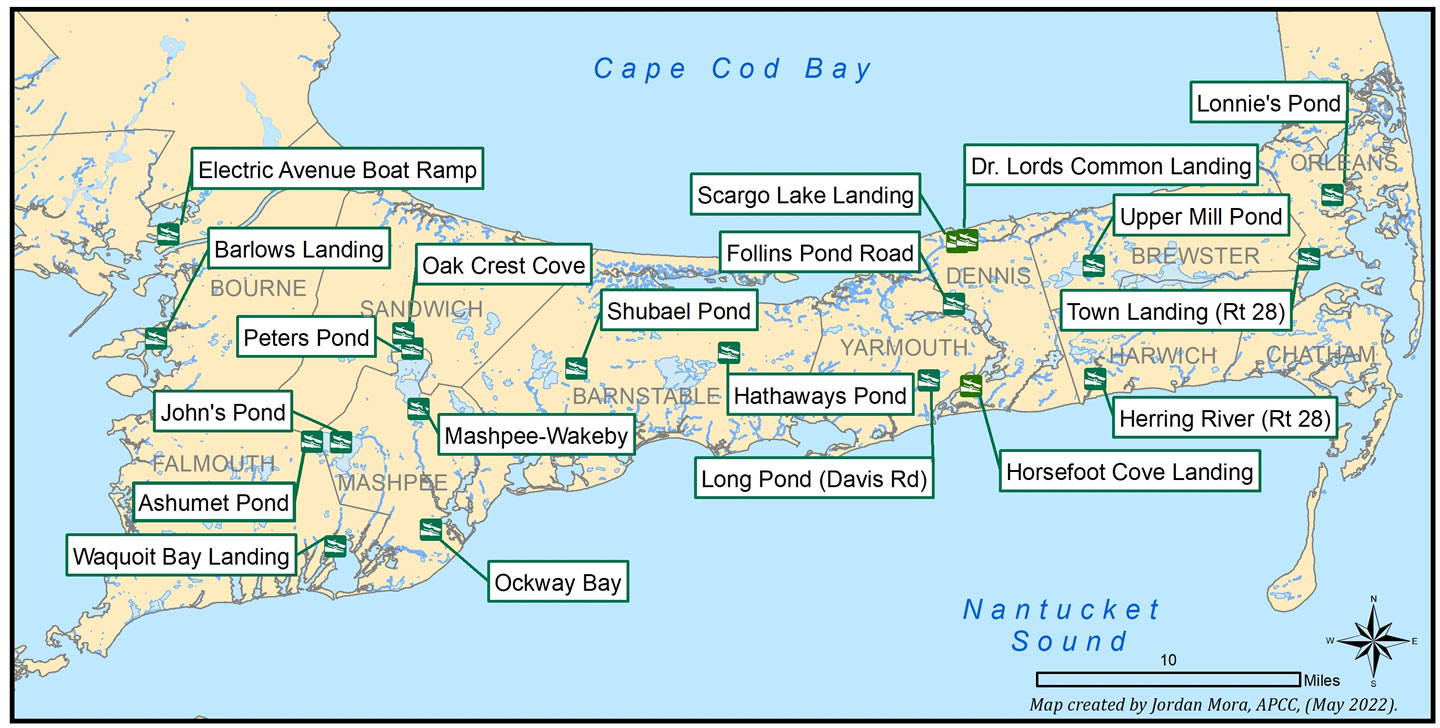 Partners - This project is in collaboration with the Massachusetts Department of Fish and Game Office of Fishing and Boating Access and the following towns: Barnstable, Bourne, Brewster, Dennis, Falmouth, Harwich, Mashpee, Orleans, Sandwich, and Yarmouth. Funding for this work has been provided by a U.S. Environmental Protection Agency Southeast New England Program Watershed Grant in partnership with Restore Americas Estuaries. |