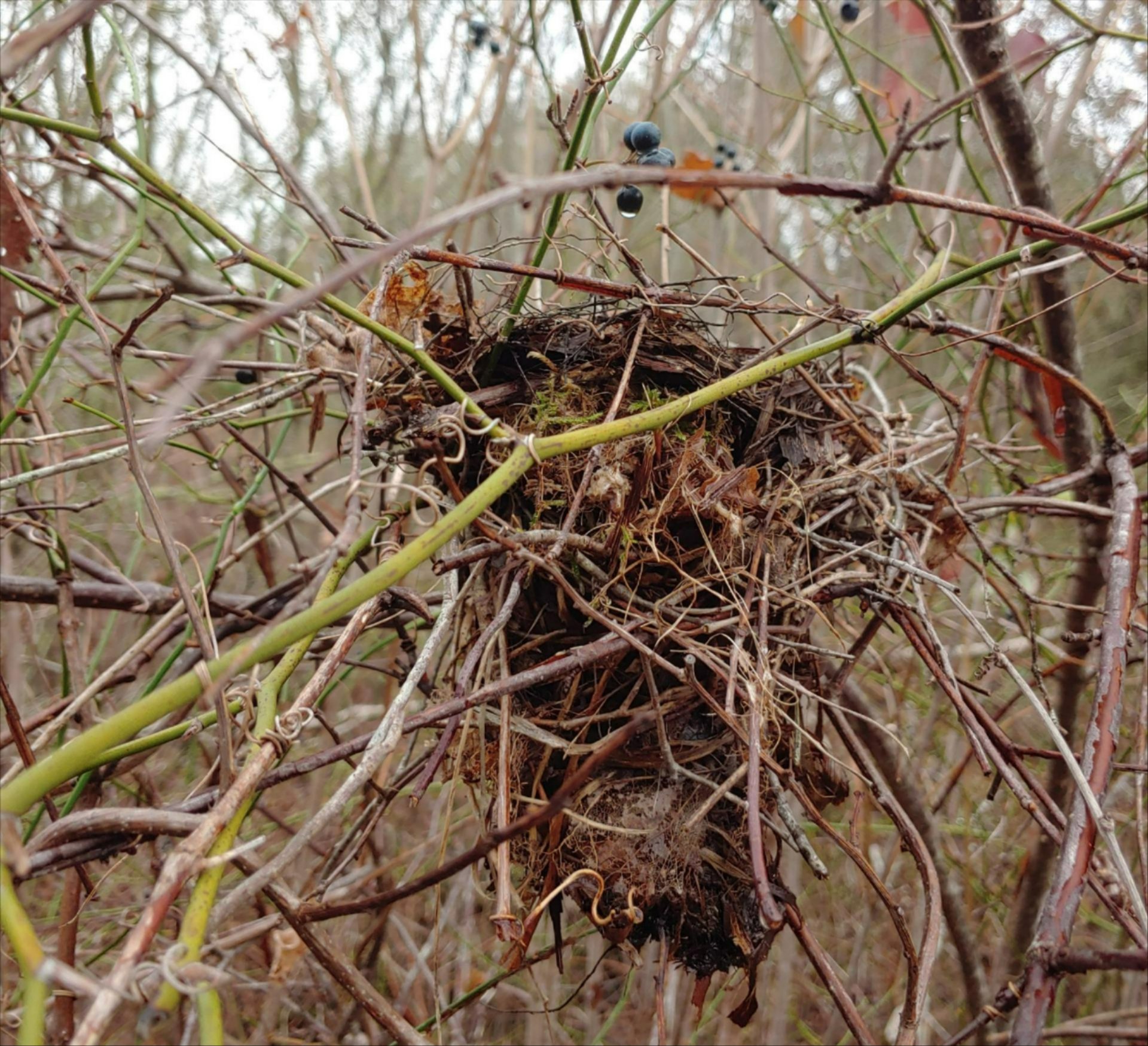 November Nests by Jillian Glover November has come and gone. The daytime temperatures started in the 70s, touching 80, warmer than in October. id-month hard frosts began to settle in. Many rainy and windy days hastened the dropping of leaves. By Thanksgiving, the forest and bog appeared sparse but tranquil. The energy put forth producing the bounties of the spring, summer, and fall months has come to a close.