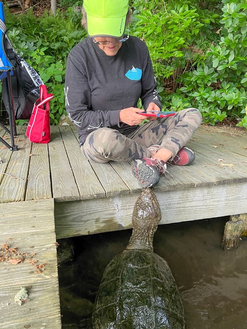 Susan Baur, aka "Turtle Lady," and a snapping turtle at Dam Pond, Falmouth. Photo credit: Robin Melavalin |