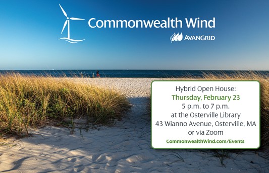 February's hybrid Open House will include an overview of AVANGRID’s work in Barnstable and the Commonwealth Wind project. Commonwealth Wind proposes a cable landing underneath the Dowses Beach parking lot in Osterville. You can find out more at CommonwealthWind.com/events. Thursday, February 23