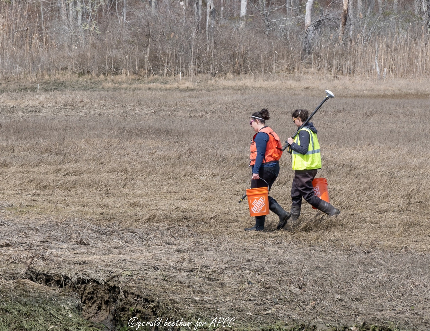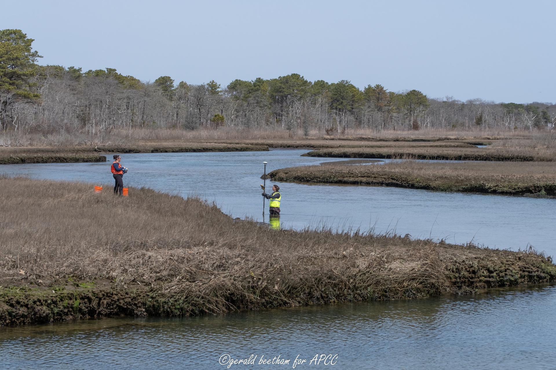 Early season field work for APCC's restoration ecologists, April Wobst and Jordan Mora, as data loggers were deployed in Parkers River in Yarmouth to measure the impact of tidal restoration. The benefits of the early season work are few bugs and great views of ospreys recently returned to their nests. |