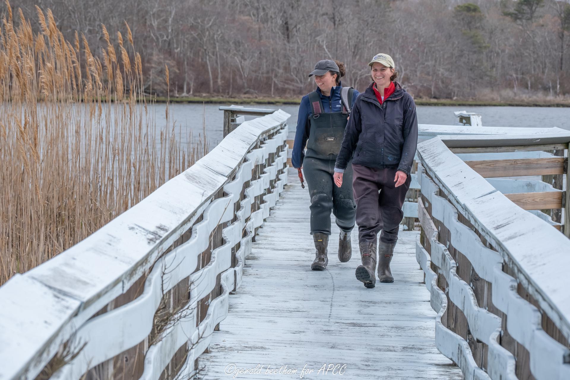 Avalon Hadley, AmeriCorps member, and Jordan Mora, APCC restoration ecologist, check water level and salinity loggers at Parkers River marsh in Yarmouth. APCC continues to monitor the hydrological impacts of the tidal restoration resulting from the Route 28 bridge enlargement at this marsh by deploying loggers throughout the system for a one-month period. Originally from Foxboro, MA with a degree in anthropological sciences, Avalon is close to finishing her one-year term with AmeriCorps on Cape Cod and was eager to learn more about APCC’s restoration work. She plans to pursue a graduate degree studying sustainable agriculture and soil health. Photos courtesy of Gerry Beetham. |