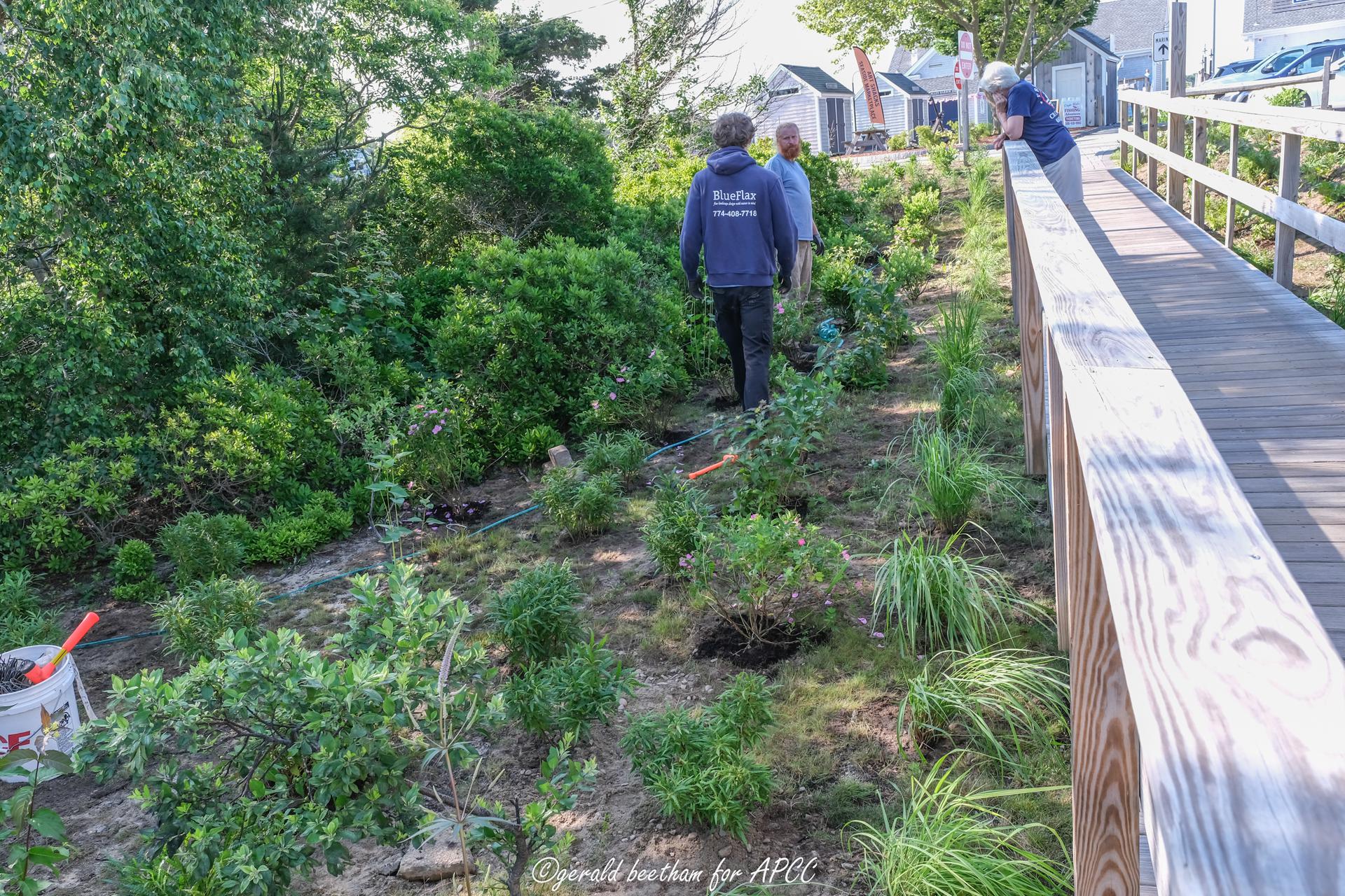 We are excited to announce a new native planting project that was completed at Saquatucket Harbor just before the July 4th holiday—an APCC project with the town of Harwich and BlueFlax Design. Native shrubs and perennials have been planted on either side of the boardwalk that leads from the parking lot and ticket booths to the marina. Native perennials were also planted in two locations near the art sheds. The purpose of these plantings is to draw attention to native plants and their value to pollinators and wildlife. But they also offer beauty without the need for fertilizers that contribute to the excess nutrients in the Cape's coastal waterways. This native planting expands on the good work the town and the Harwich Garden Club has been doing around town on similar native plant projects. (And thanks to Gerald Beetham for documenting the work with these photos!)