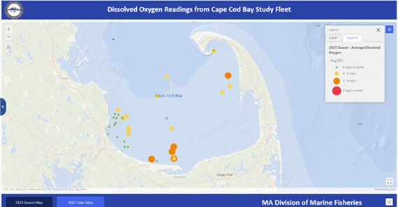 "Environmental sensors deployed by the Cape Cod Bay Study Fleet and by the Center for Coastal Studies, who are working cooperatively with DMF, have once again detected low oxygen zones in Cape Cod Bay.