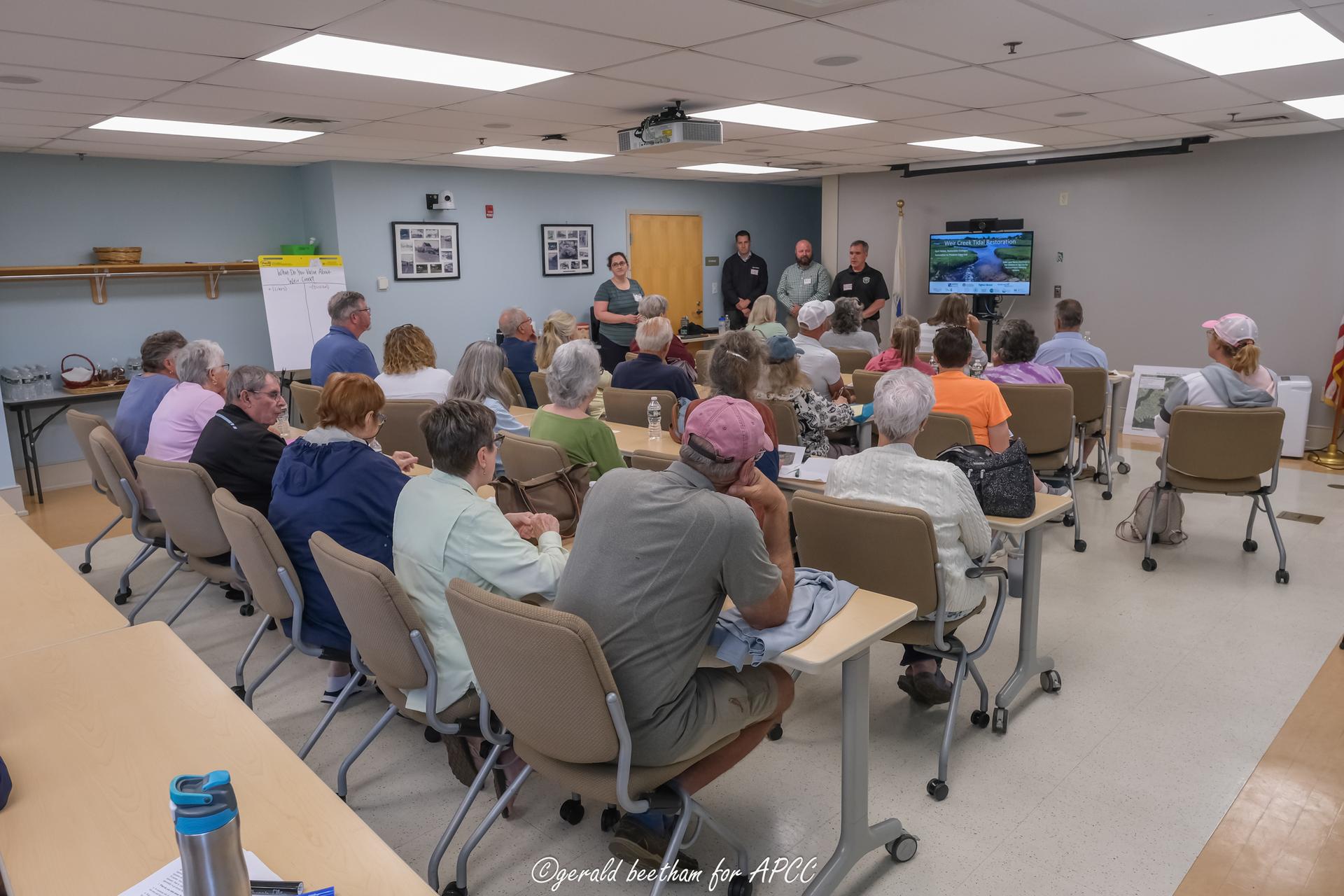 APCC and project partners from Tighe & Bond, Woods Hole Group, the Town of Dennis, present an initial project outline for the Weir Creek restoration project at a public meeting. APCC is helping with project management for the preliminary funding, data collection, modeling, and early design phases of the Weir Creek tidal restoration. Two culverts on Lower County Road in Dennis are to be replaced, and the project team is seeking public input on the project and hoping to keep stakeholders informed at the different project stages.
