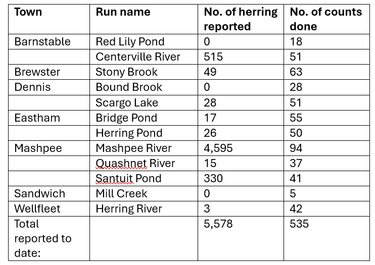 As of April 16, 2024, volunteer herring monitors reported herring counts in the following herring runs: |