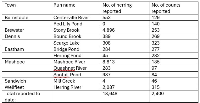As of May 24, 2024, volunteers were still counting herring in a number of Cape Cod runs. To date, the cumulative total counts at different runs were as follows: |