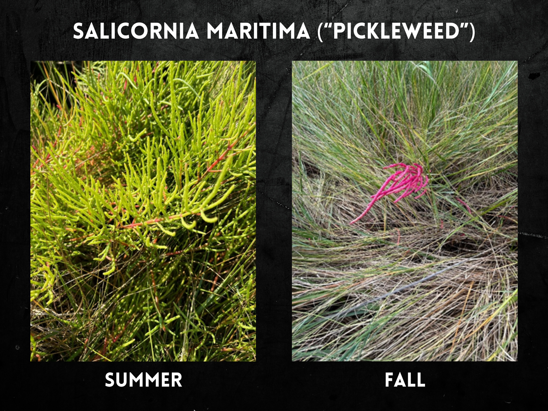 Another common salt marsh plant is the succulent Salicornia maritima, commonly known as “sea bean” or “pickleweed” for its briny taste (yes, it is edible!). Pickleweed undergoes a dramatic transformation between summer and fall, going from bright green to hot pink. Like smooth cordgrass and saltmarsh hay, pickleweed plays an important part in creating a robust marsh ecosystem. |