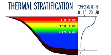 The surface layer, referred to as the epilimnion, is the warmest layer, impacted by surrounding air temperature. This layer often starts forming in the spring as air temperature rises and winds die down and it becomes deeper as air temperatures continue climbing in the summer months. If you enjoy swimming in the ponds, you have probably felt the transition from this surface layer to the middle layer, known as the metalimnion. The temperature drop from the surface layer to the middle layer is typically the greatest drop and is referred to as thermocline.