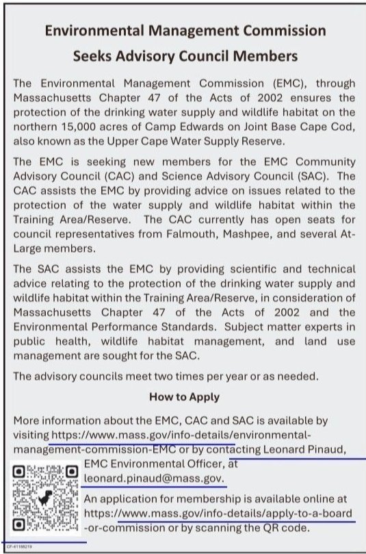 The Environmental Management Commission (EMC) ensures that the training at Joint Base Cape Cod is compatible with the protection of the Upper Cape Water Supply Reserve. The EMC, by law, is advised by a citizens advisory council and a science advisory council. Both bodies have numerous vacancies, and the EMC is seeking the names of people for appointment by the governor.