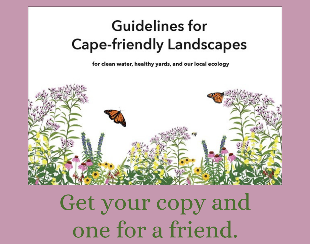 The Guidelines gives homeowners steps they can take in the design and maintenance of their properties that will support pollinators and birds, manage stormwater, conserve water, and protect the Cape's water quality. This 40-page booklet is beautifully illustrated by Marcy Ford with content that is easily digestible and supported by numerous resources for additional learning.