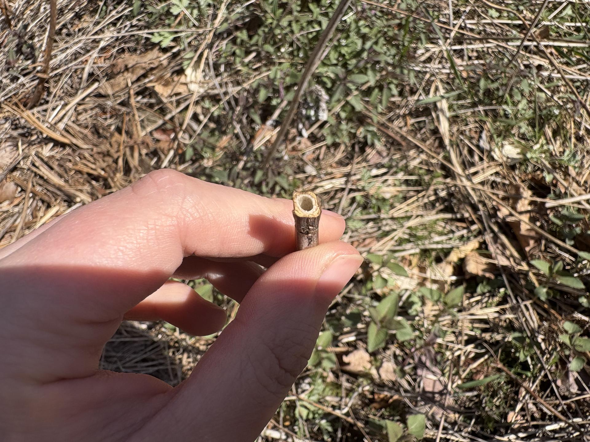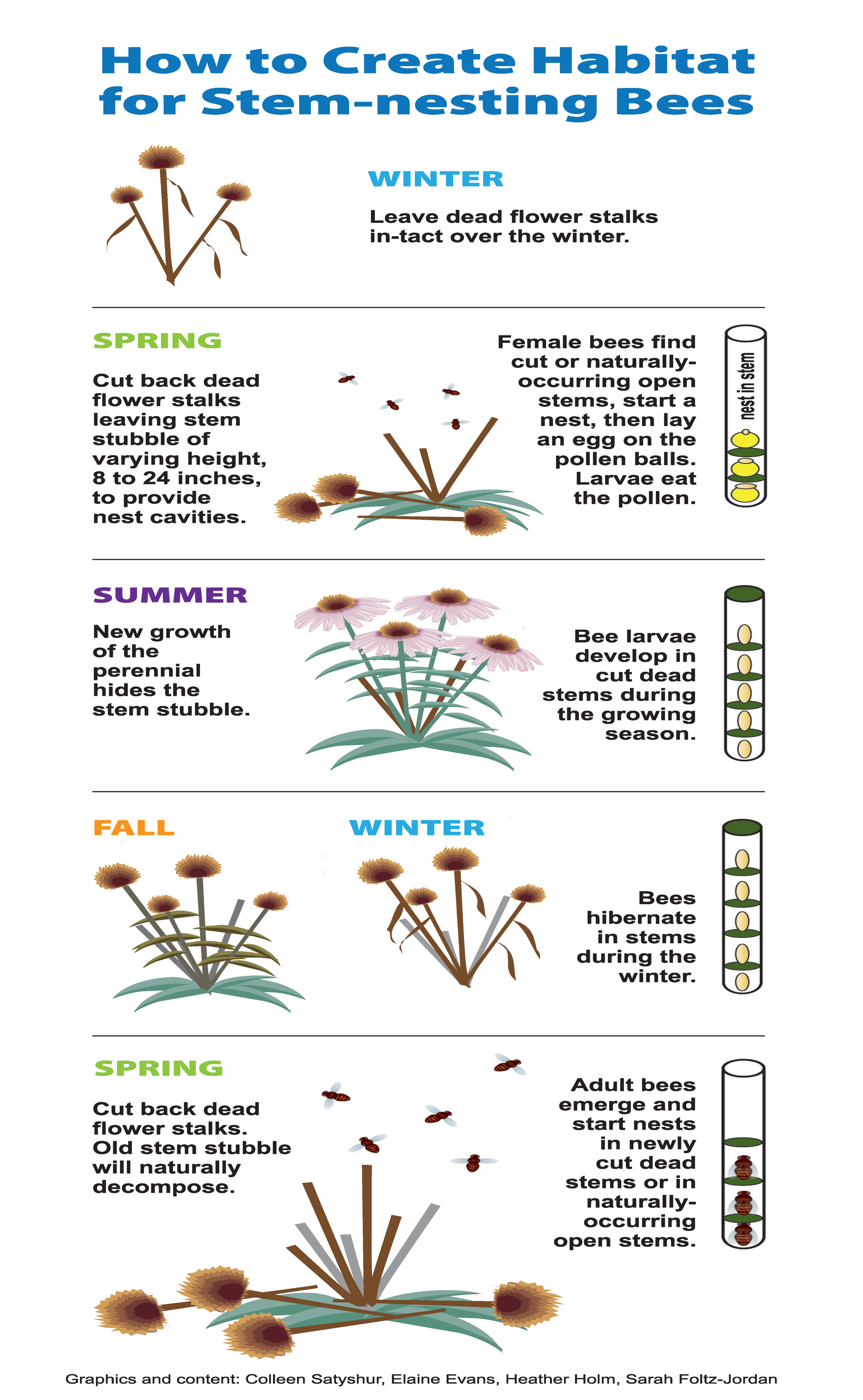 As we get into the best practices surrounding dead stems, let’s circle back to the lifecycles of our cavity nesting insects. Around 30 percent of our native bees are cavity nesters, meaning they find the dead woody stems of perennials, and crawl or burrow inside. These bees, but also solitary wasps, stem-boring moths, and other beneficial insects use these stems as places to lay their eggs. Over the next year, these eggs will develop over the growing season and hibernate through the winter. They emerge the following spring, chewing their way out and flying off to pollinate, and eventually to start the next generation in another dead woody stem.