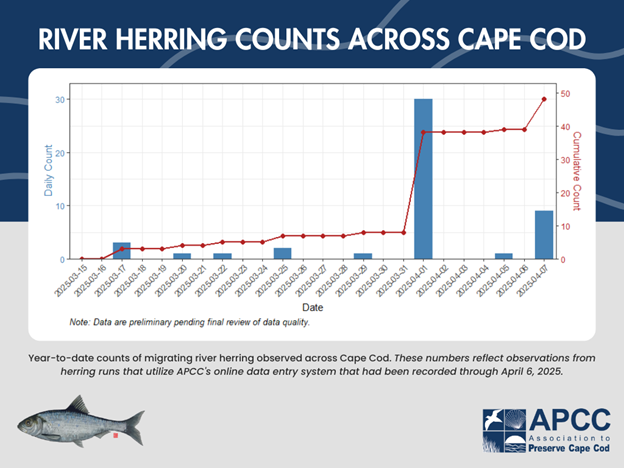 So far, river herring have been recorded at several runs, including Long Pond in Yarmouth, Mashpee River and Santuit River in Mashpee, Stony Brook in Brewster, Trunk River in Falmouth, and Herring River in Wellfleet. Meanwhile, some sites—like Pilgrim Lake in Orleans—are still awaiting the fish’s arrival and managers are conserving what little water they have in anticipation. Fingers crossed that this weekend’s rain has brought some relief.