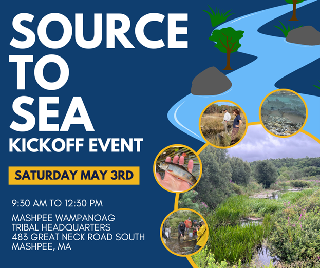 The Source to Sea Community Engagement kickoff event will be held Saturday, May 3rd, from 9:30 a.m. to 12:30 p.m. at the Mashpee Wampanoag Tribal Headquarters.