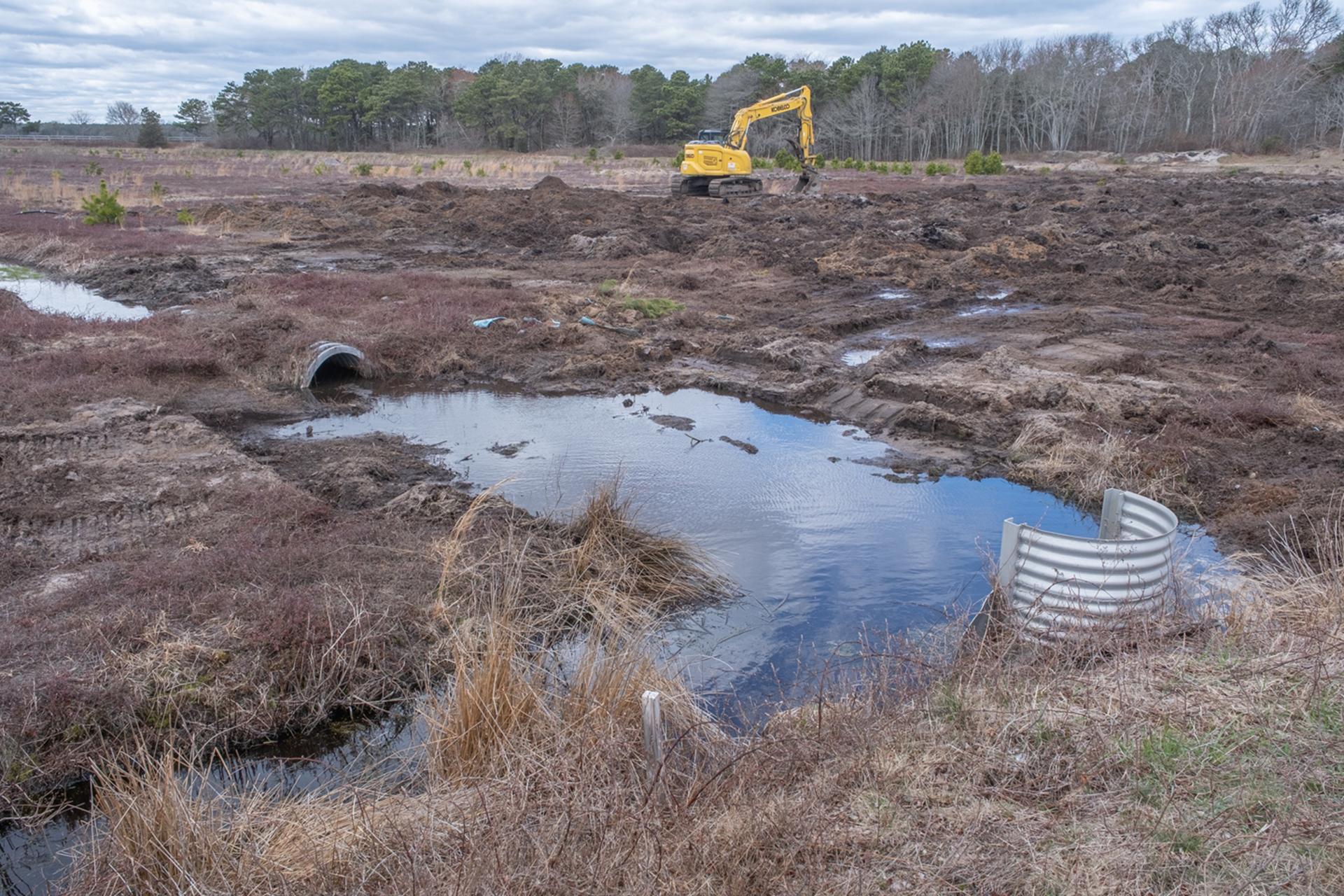 Above: An excavator shapes the land at the Hinckleys Pond–Herring River Headwaters Eco-Restoration Project, a former cranberry bog. Old water control structures from the bog system can be seen in the foreground. The machine is creating small bumps and dips in the ground—a technique called microtopography—to mimic the natural surface of wetlands. These subtle changes in elevation help hold water, support a variety of plants, and create better habitat for wildlife. By breaking up the flat, compacted bog, the restoration team is speeding up the return of a healthy, self-sustaining wetland.