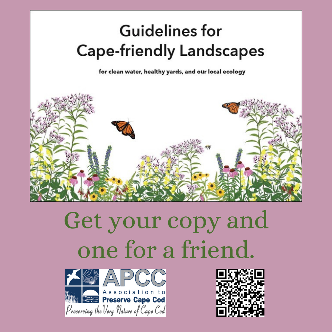 The Guidelines gives homeowners steps they can take in the design and maintenance of their properties that will support pollinators and birds, manage stormwater, conserve water, and protect the Cape's water quality. This 40-page booklet is beautifully illustrated by Marcy Ford with content that is easily digestible and supported by numerous resources for additional learning.