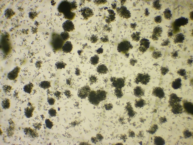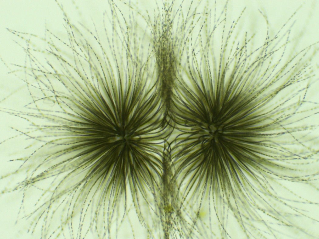 One of the most unique formations of cyanobacteria, Gloeotrichia, forms in colonies that look like puffer balls or pom-poms with both the heterocyst and akinete at the base. This makes them easy to spot and generally large compared to other cyanobacteria colonies that we see. While this is a rare cyano for us to spot in the lab, it has been seen recently, and it is important to denote because it can also produce microcystin.