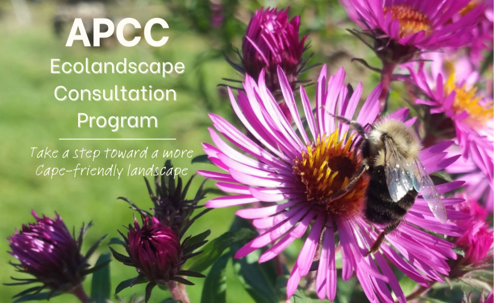 APCC’s Ecolandscape Consultation program is aimed at helping homeowners make their landscapes more ecologically friendly by providing site-specific assessments and oodles of information for the DIYers or those that want to be more informed to hire the right landscape contractor. While we are not landscape designers or engineers, we do have the passion, experience, knowledge, and loads of resources to offer guidance to help you achieve your goals for a Cape-friendly yard.