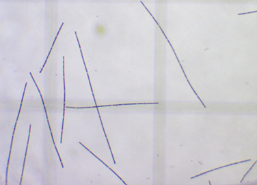 Aphanizomenon looks eerily similar to grass clippings under the microscope, created by unicellular chains that connect. This type of cyanobacteria can produce many types of cyanotoxins, including the dangerous neurotoxin Anatoxin-a which can cause rapid paralysis of skeletal and respiratory muscles. |