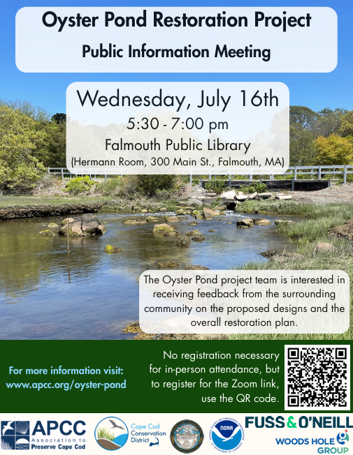 For more information, please visit the Oyster Pond Tidal Restoration website. For questions, please contact Jordan Mora, lead ecologist at APCC (jmora@apcc.org).