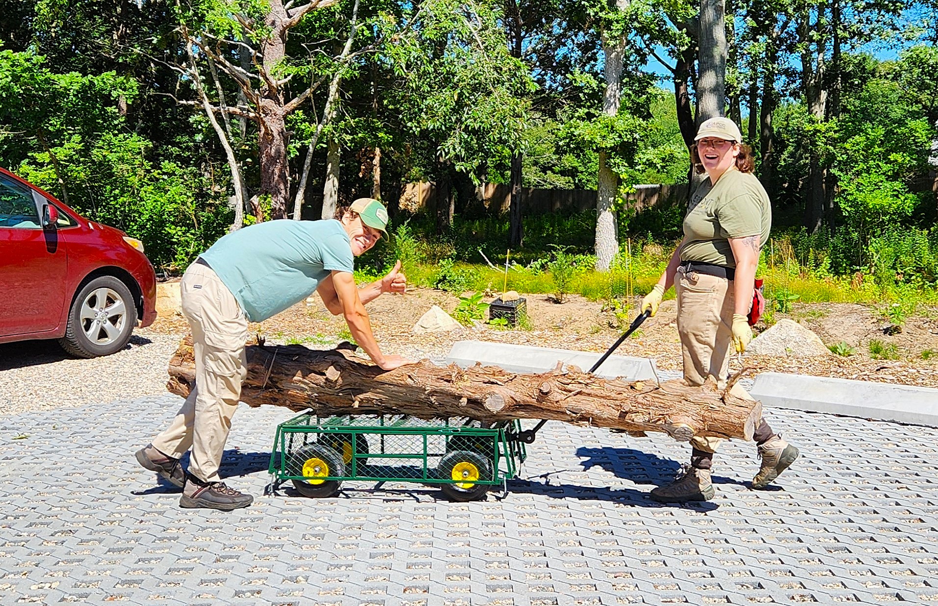 Above: Ecological land care intern, Alan Ives, and APCC's ecolandscape program coordinator, Erin Camire, moving repurposed cedar trunks we salvaged from the construction project for positioning in the rain garden to mimic a river restoration project! |