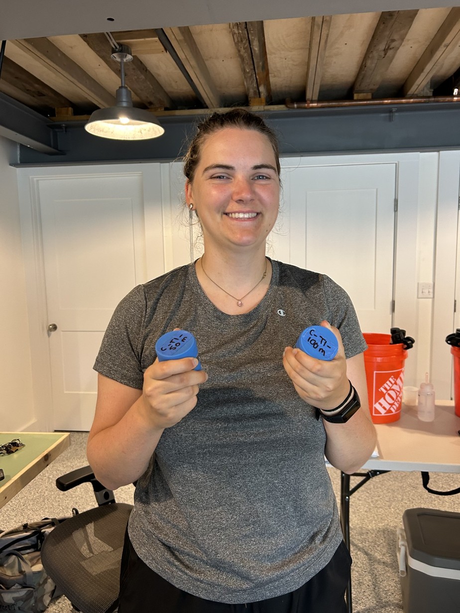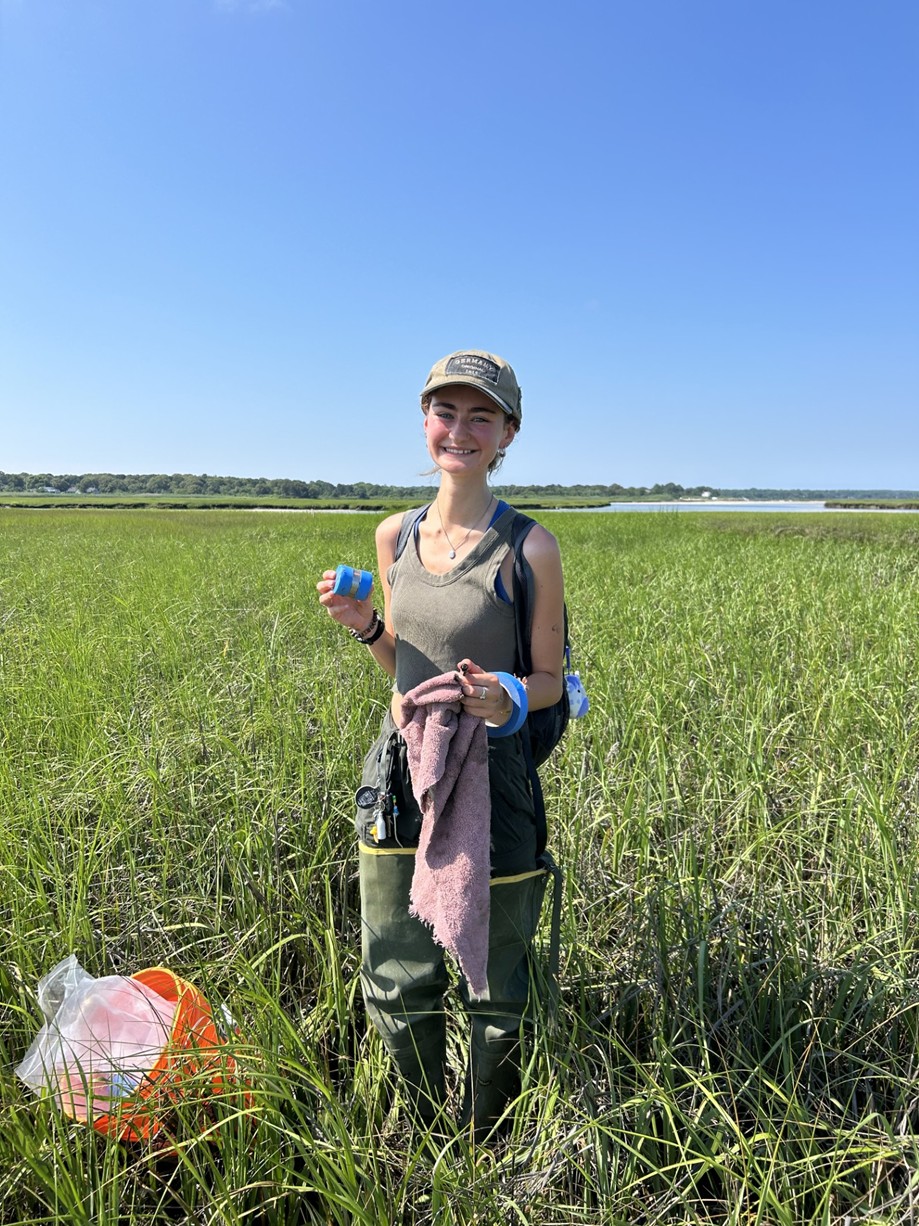 Above: (Left) Tina Hennig shows some of the samples she helped collect at Chase Garden Creek. (Right) Sophie Cosaro labels a sediment sample at Chase Garden Creek salt marsh. |