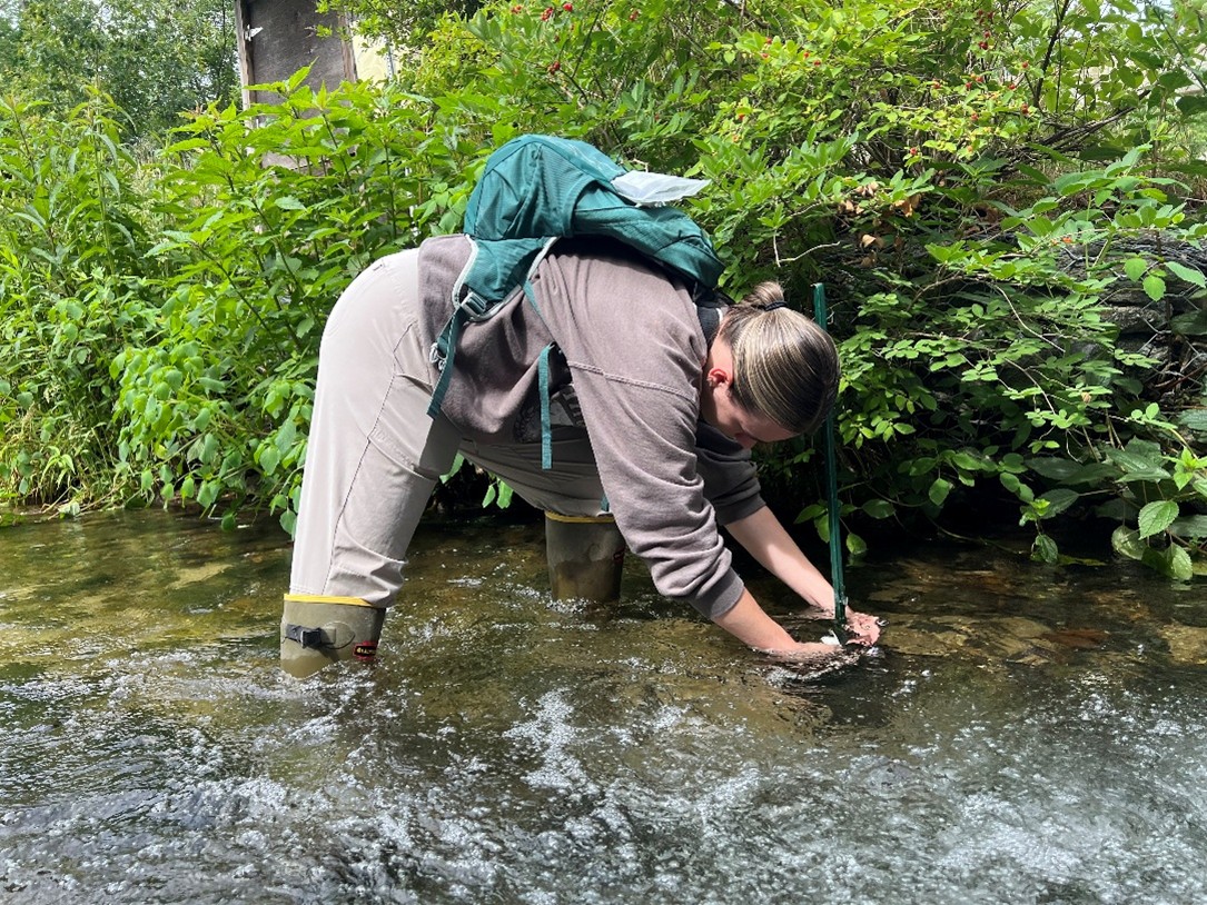 Above: Hannah Brown, APCC restoration coordinator, collecting data from a temperature logger deployed at Mashpee River. |