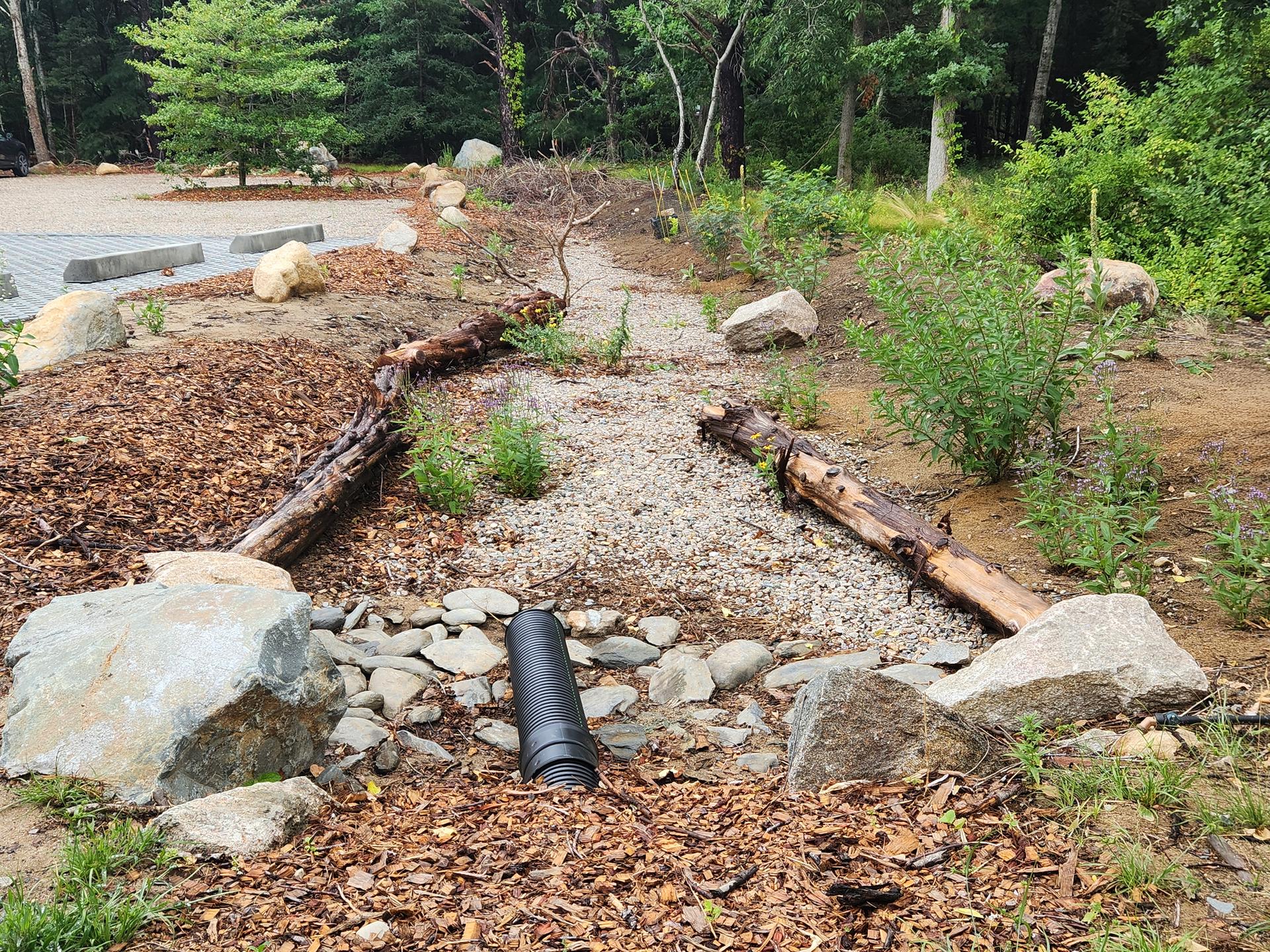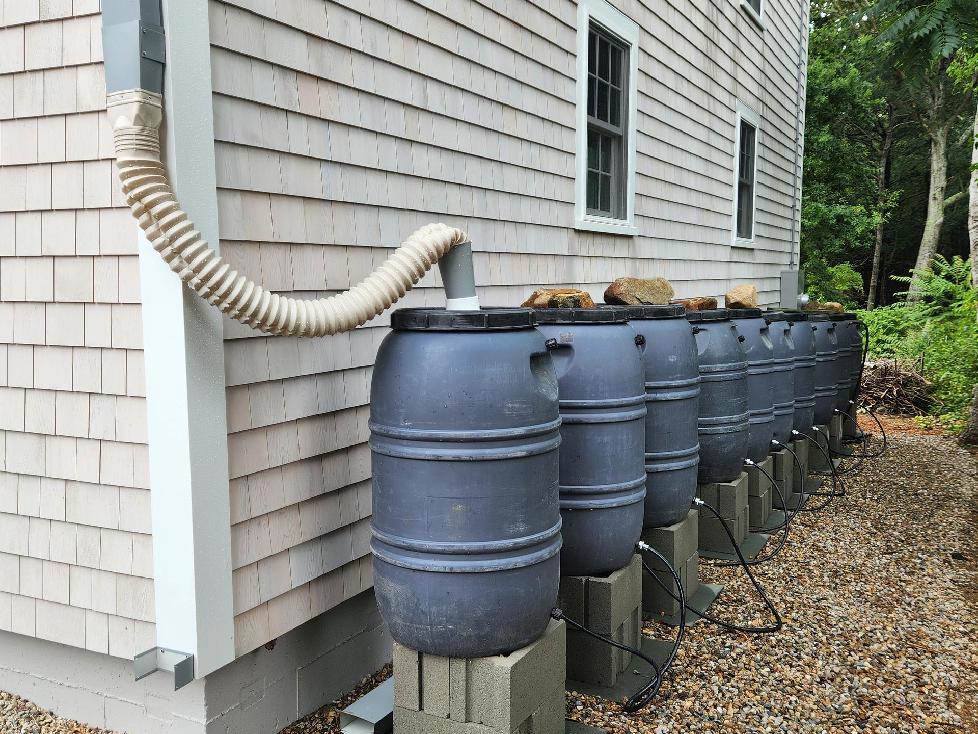 The stormwater coming off of the Koppel Center metal roof is cleaner than from an asphalt roof. We collect half of what falls on the roof in rain barrels—when they are full, the overflow is directed to the rain garden. |