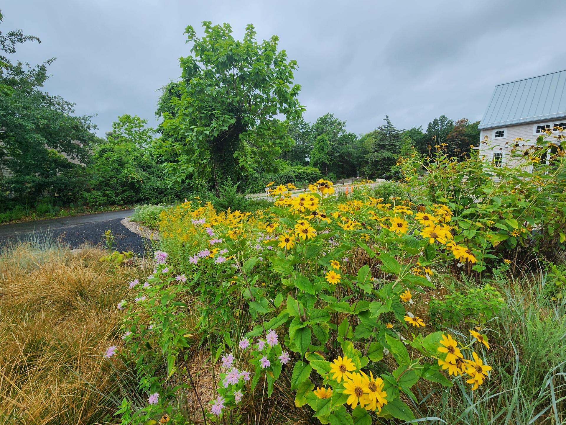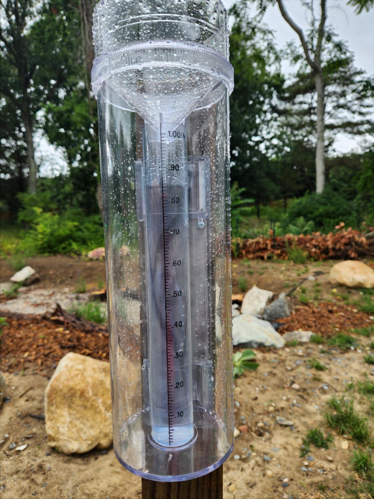 We were able to measure the day of rain we experienced recently with our new rain gauge. A little over eight tenths of an inch fell on August 1. Better than nothing, but our landscape, like all of Cape Cod, needs more. The gauge is installed on a post next to the rain garden behind the Koppel Center—this is the rain garden that receives all of the roof runoff from the Koppel Center.