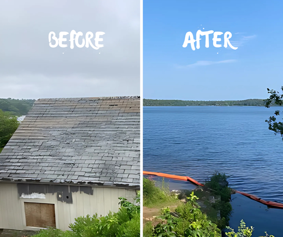 Above: The view of Hinckleys Pond from the Cape Cod Rail Trail prior to the pumphouse demolition (left) and after (right). Photo credit: Harwich Conservation Trust. |