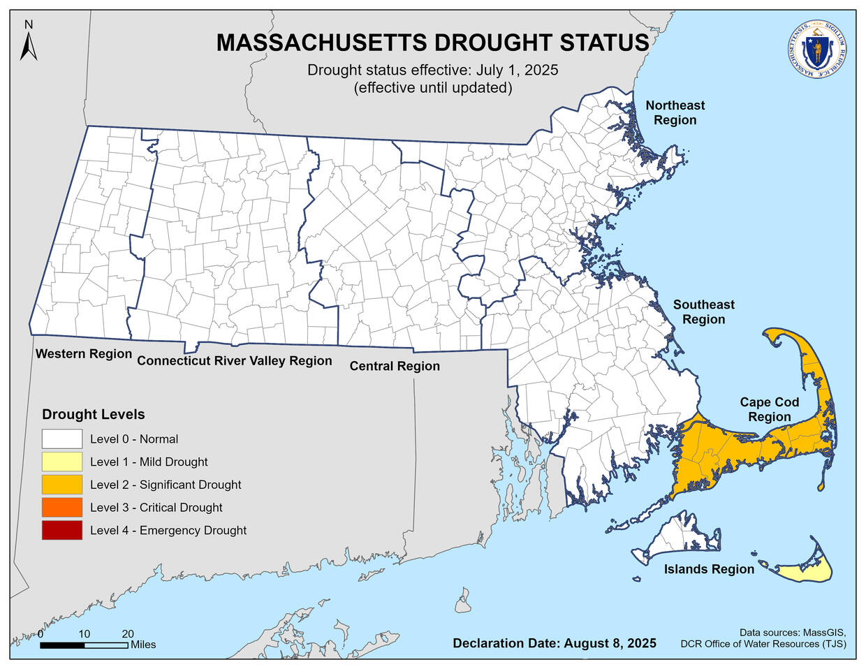 BOSTON – Today, [August 8, 2025] Energy and Environmental Affairs (EEA) Secretary Rebecca Tepper declared the Cape Cod Region has been upgraded to a Level 2 - Significant Drought from a Level 1 – Mild Drought last month. The Southeast, Connecticut River Valley, Western, Central, and Northeast Regions remain at Normal Conditions, although conditions are starting to dry all across the state. Nantucket County is currently at a Level 1 – Mild Drought, while Dukes County remains at Normal Conditions within the Islands Regions.