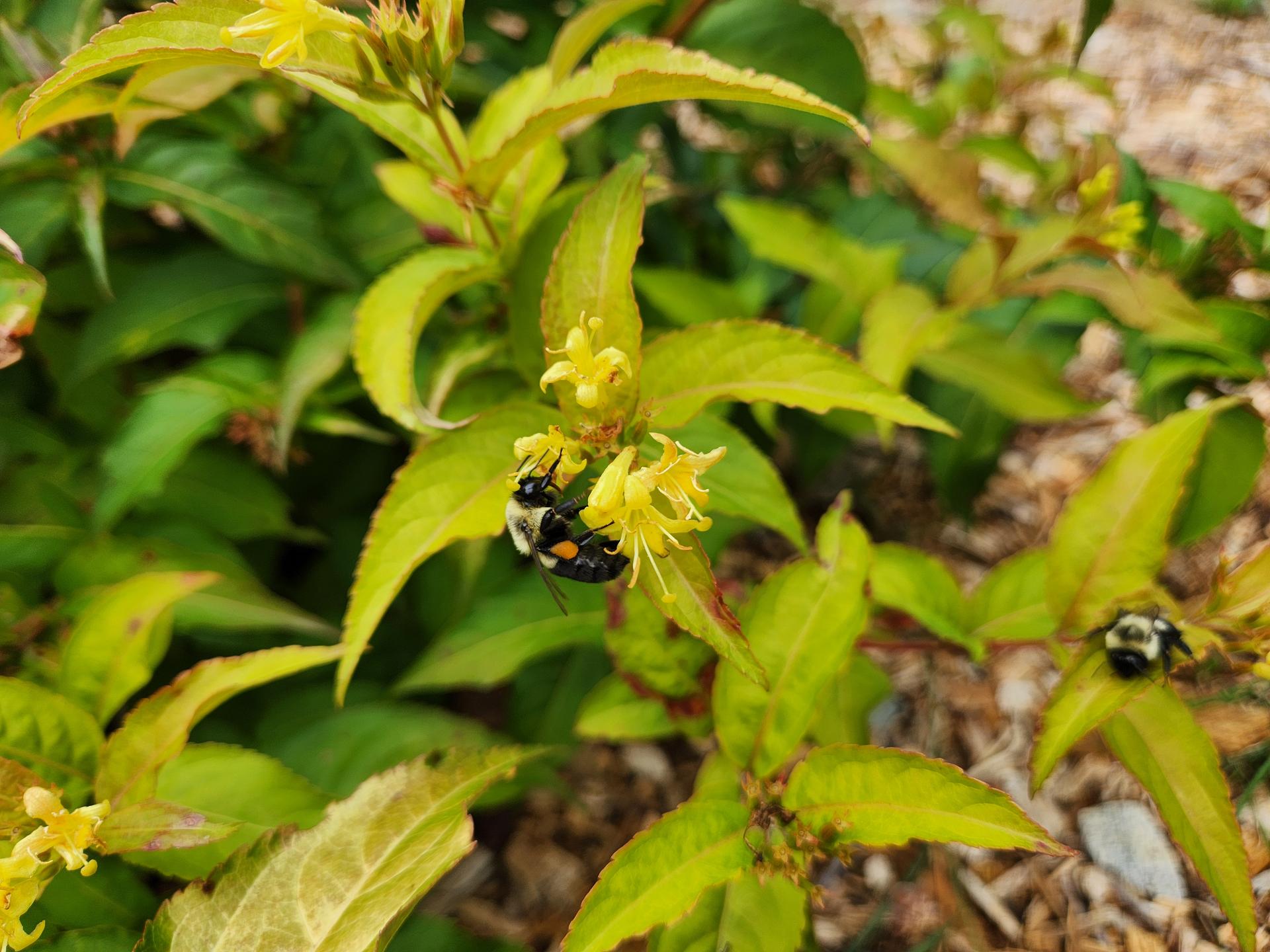 Our butterfly milkweed, Asclepias tuberosa, was planted earlier this summer and it was a pollinator hub last week. Common bumble bees and pearl crescent butterflies were loving the flowers. |