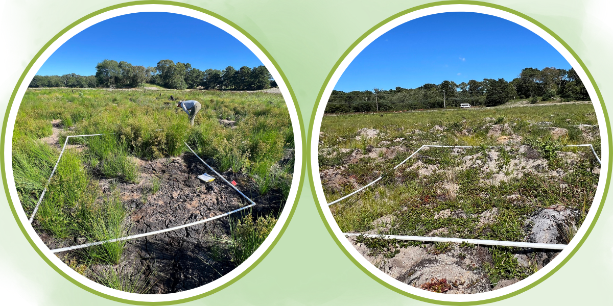 Above: Examples of the two restoration approaches used at Hinckleys Pond. The plot on the left shows a site where sand was removed, exposing layers of peat, while the plot on the right shows a site where no sand removal was conducted. |