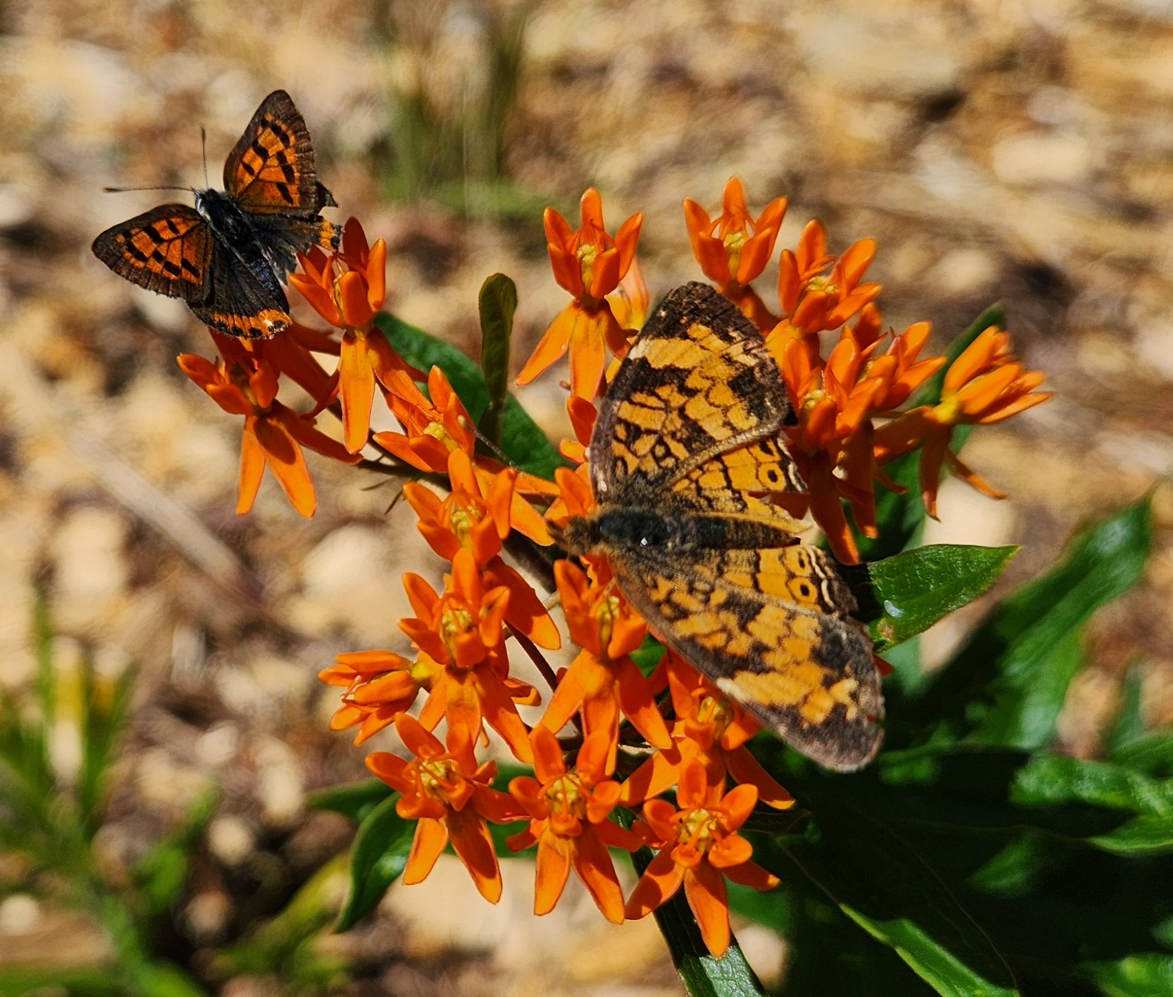 Above: American copper (left) and pearl crescent (right) butterflies on butterfly milkweed |