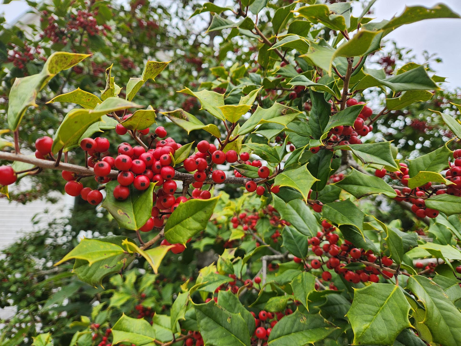 This is American holly, Ilex opaca, and it is looking glorious in our landscape right now! We are so glad that we saved these native holly trees from the disturbance caused by the construction of the much needed parking area to serve the Koppel Center. Hollies are dioecious, meaning staminate and pistillate flowers are found on different individuals. In this regard, we commonly make the reference that there are male and female plants—the male providing the pollen and the female bears the fruit. Two of the hollies are fruiting and one is not. Sometime this winter, the trees will be ravaged by robins and other frugivores—thrilled to find the berries for winter sustenance. We hope we are present to observe the feeding frenzy! |