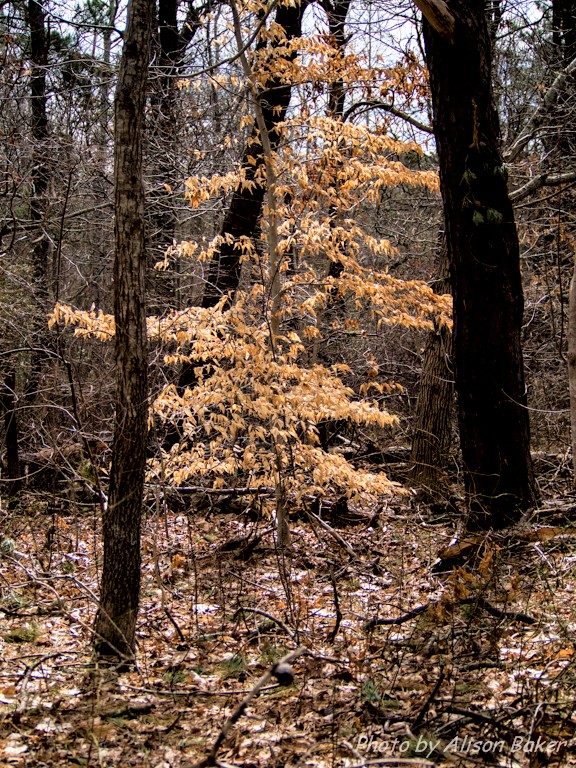 About now, all the leaves are gone from the deciduous trees. Well, almost. Some still persist. In the pine-oak forest, you may spy a ten-foot tree, seemingly all by itself, still in full leaf garb, albeit brown leaves. This is an American beech. Others still have brown leaves, too—the oaks, particularly the younger oaks and the lower branches. Have you ever noticed? When plants hold onto their dead brown leaves through the winter, it’s a phenomenon known as marcescence (pronounced mar-SES-sense).