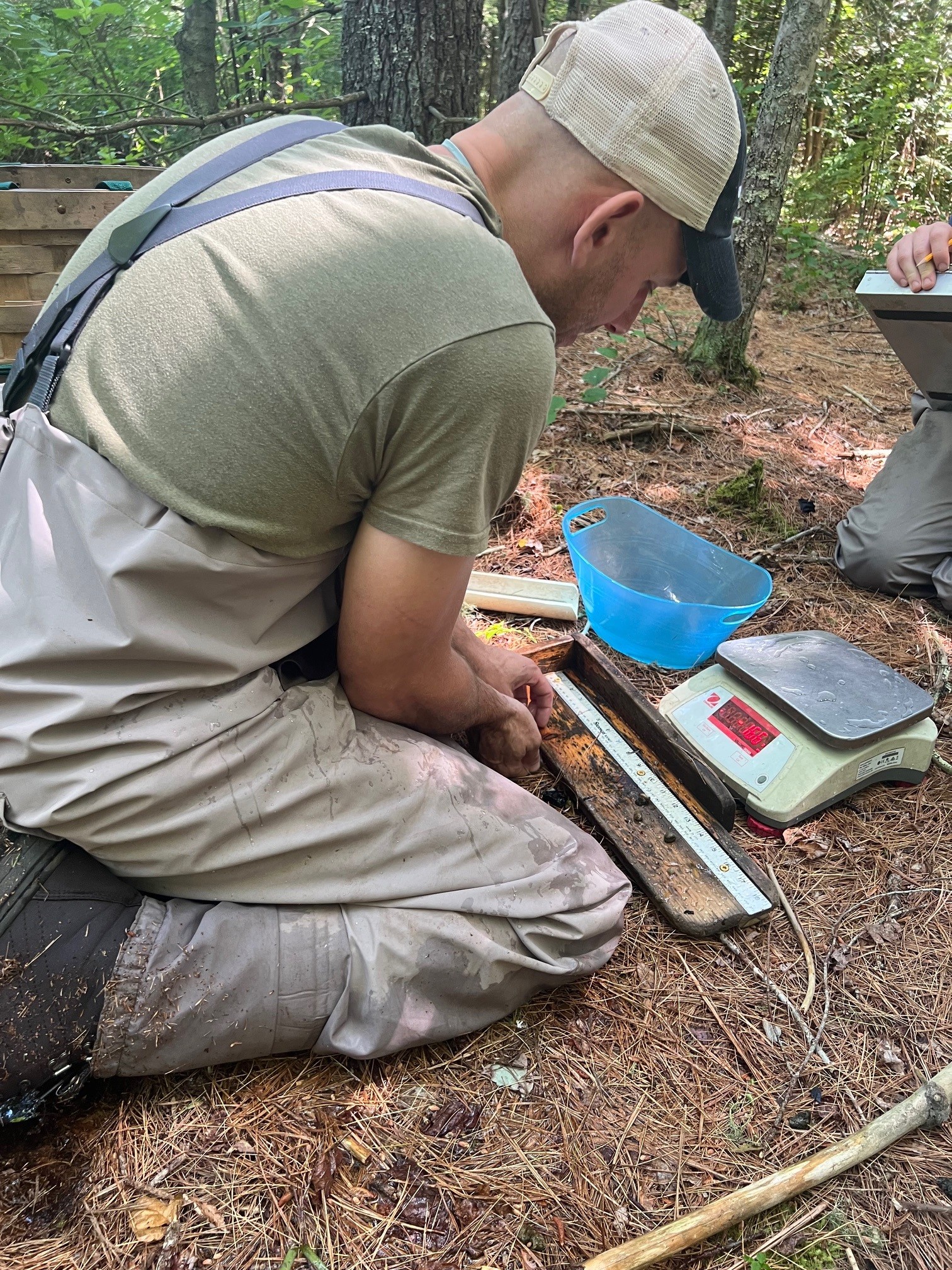 Above: MassWildlife Biologist Joe Facendola prepares to take a length measurement on an American brook lamprey caught in the Mashpee River. |