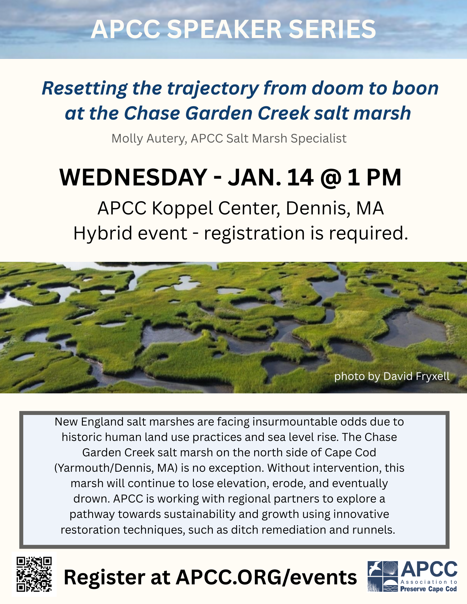 Please join us on Wednesday, December 10th, at 1:00 p.m. at the Koppel Center (or online via Zoom) to learn more about how salt marshes protect our cultural heritage and livelihoods—and how resetting them on a course toward recovery and resilience can safeguard our coastal future. Register here.