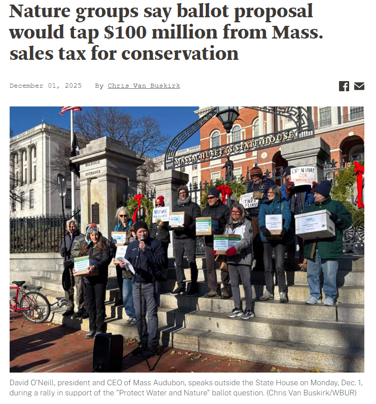 With your help, the Nature For Massachusetts coalition of environmental, conservation, and community organizations collected more than 75,000 signatures to advance the "Protect Water and Nature" ballot initiative toward the 2026 statewide ballot. The ballot would set aside revenue from the existing state sales tax on sporting goods to protect and conserve water and nature. That means $100 million each year to support the conservation and restoration of water and natural areas in Massachusetts. Learn more about the initiative here.